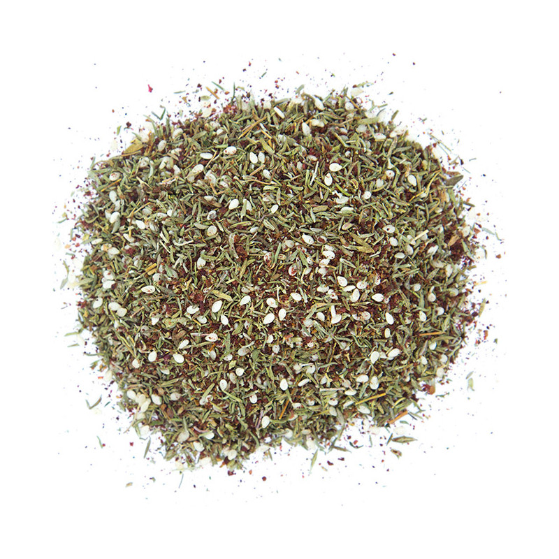 Ingrédients : sésame (dont une partie toastée), sumac, 14,6% thym (thymus spp), 5% origan (origanum spp),4% sel fin.